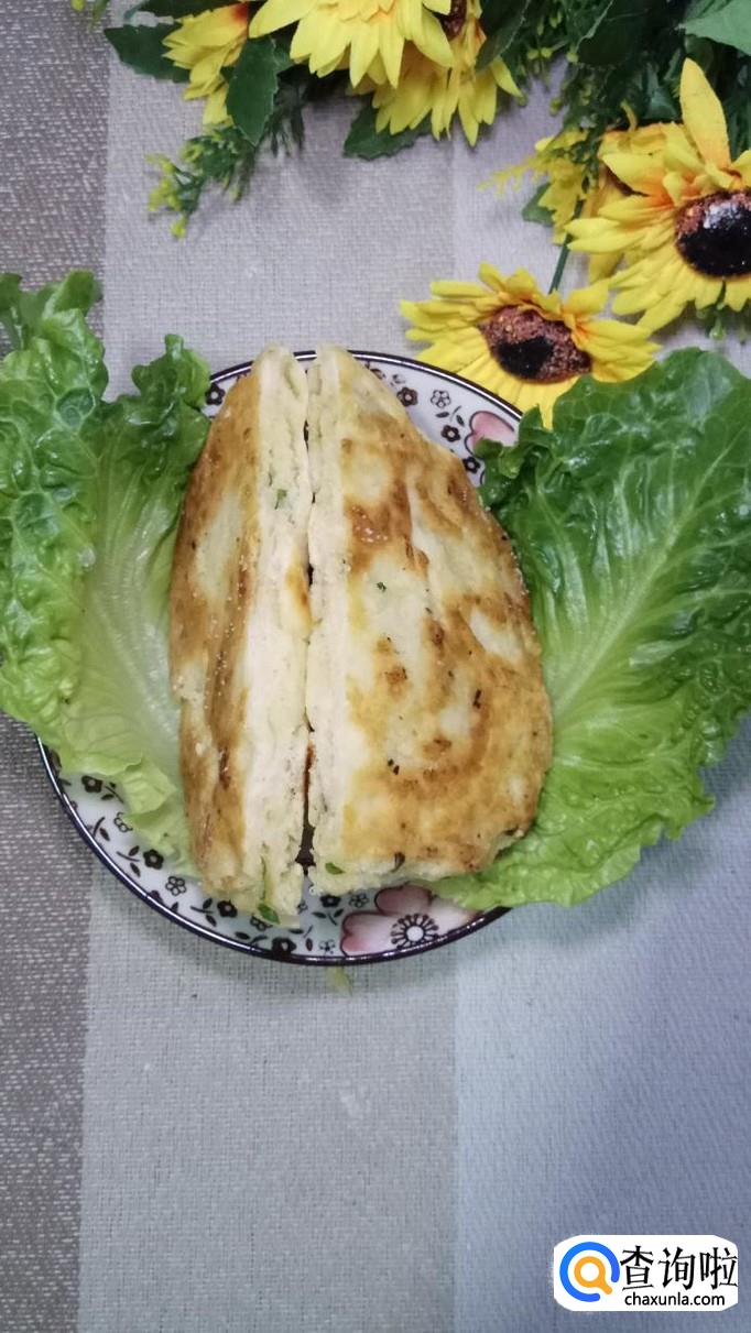 盘子中放入少许生菜,然后将做好的饼放入盘中,用刀切开手拿着吃,更加美味。