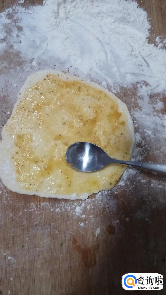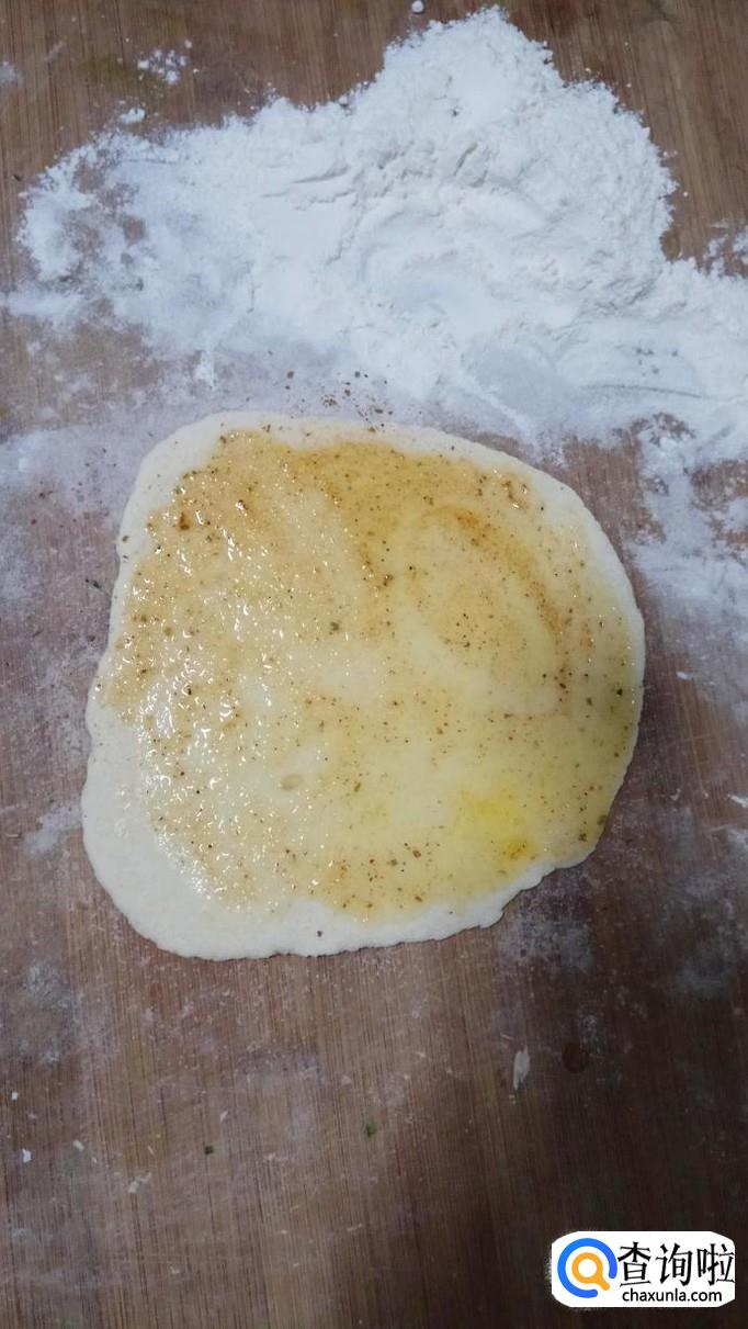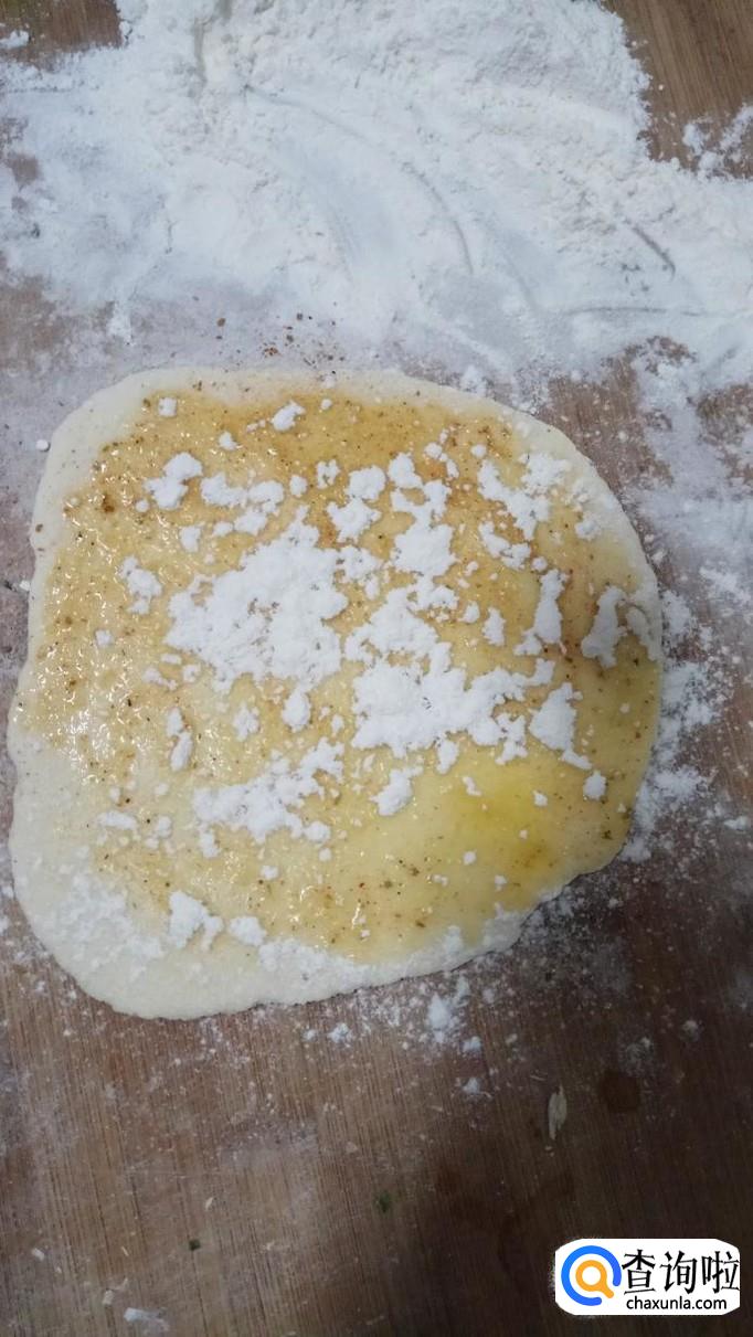 再面片上撒上适量盐,五香粉,用手搓开,撒上适量的熟的食用油,在食用油上再撒上干面粉,用勺子搅拌开,这就是油酥。