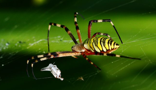 当空中飞舞的小虫误撞到蛛网上便被粘住。蜘蛛爬向前去,用钳角里的毒液,将猎获物毒痹,然后吐出―种酵素消化液,注入猎获物体内,待这种能溶解蛋白质的消化液将虫体的内部组织完全变成汁液之后,再进行吮食。因此蜘蛛吃剩下来的昆虫的空体壳,就被完整地弃留在蜘蛛网上了。