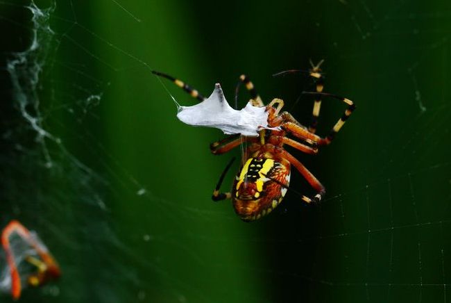 可是,你曾注意过吗,那些静静地粘在网上的小昆虫,虫体完全是空的。虫体空壳就是蜘蛛吃完美餐之后剩下来的“空罐头盒子”。尽管那剛落网的一两只小飞虫拚命挣扎,最后也逃不出变成为空壳的命运。