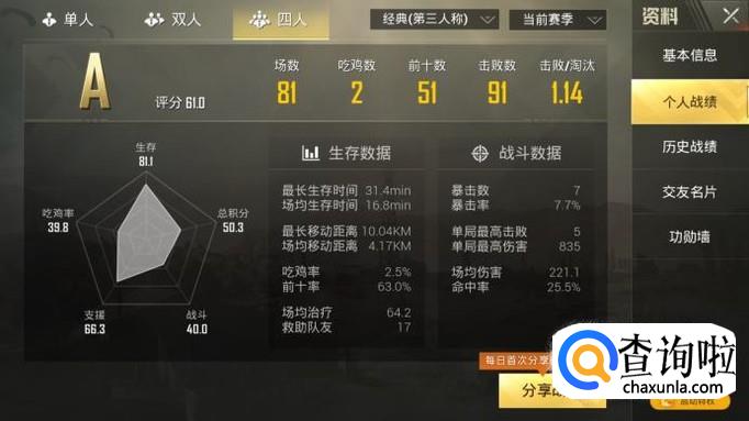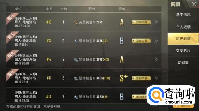 点击头像之后,会跳出来你的个人资料,基本信息下面圈出来的就是你自己的个人战绩和历史战绩,想查看什么就点击什么