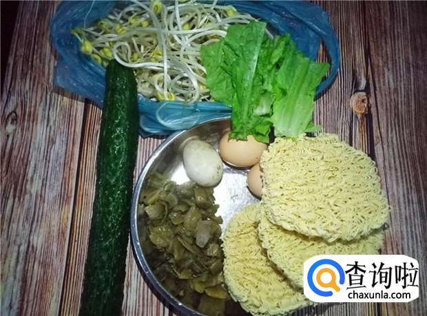 准备好所有材料:面饼3块、青瓜一根、酸菜适量、鸡蛋三颗、豆芽半斤。