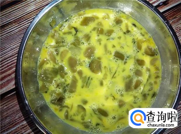 鸡蛋和酸菜一起打均匀,因为酸菜是有咸味的,所以不用另外加盐。