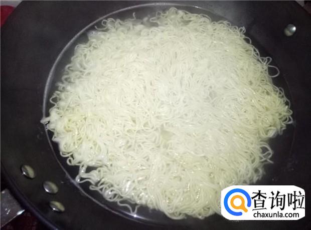 锅里烧开一锅水,先把面饼给放进去,烫到七成熟即可,捞起来打散,放凉,不要让所有的面条都粘到一块去了哦。