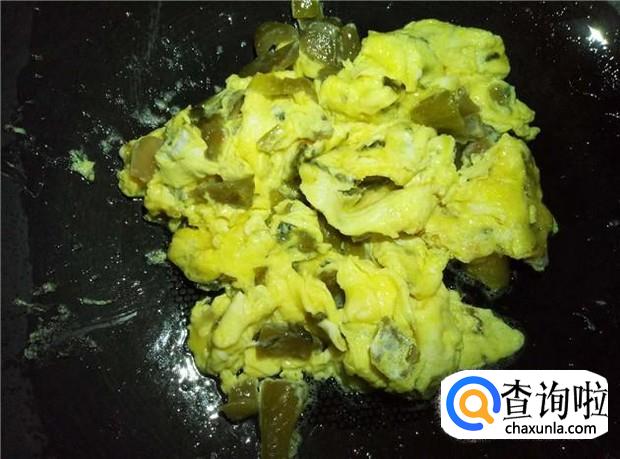 热锅下油,倒入鸡蛋和酸菜,翻炒至八成熟,捞起来备用。