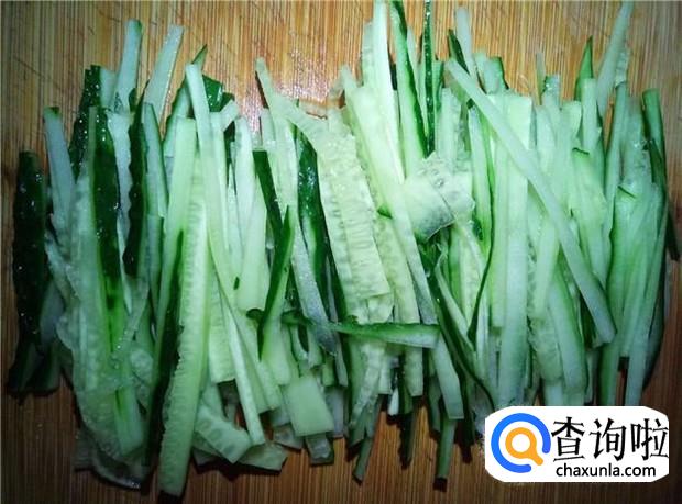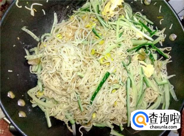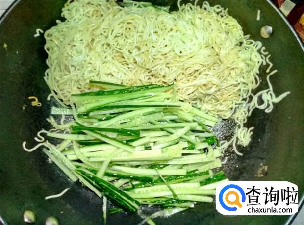 然后把面条倒进锅里,加入适量的花生油、盐和酱油,搅拌均匀,然后把青瓜丝给倒进去,开火热一下青瓜丝即可。