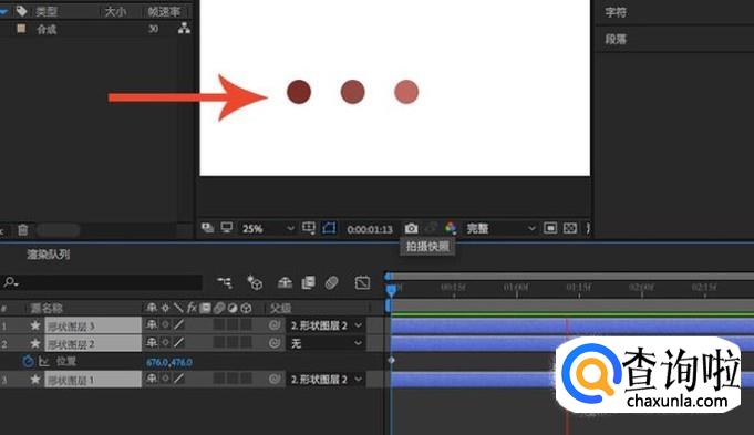 创建合成之后我们添加三个不同颜色的圆形来进行实验,需要注意的是,一定要是3个不同的图层,不能在同一个图层中添加。
