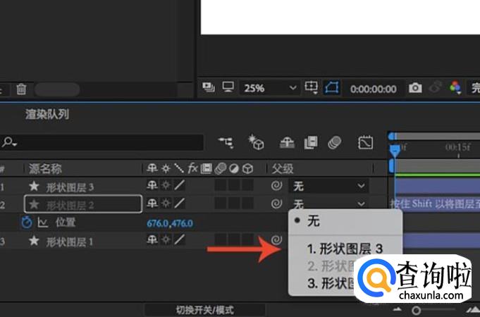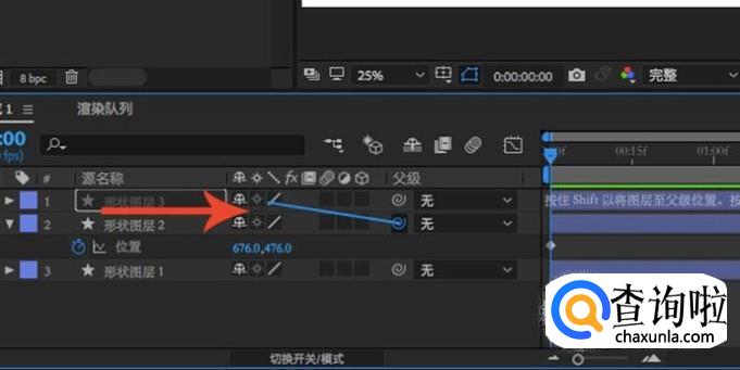 要想使用子父级的话也很简单,在图示位置我们能够看到一个圆圈,按住左键移动线条到想要添加成父级的图层即可。