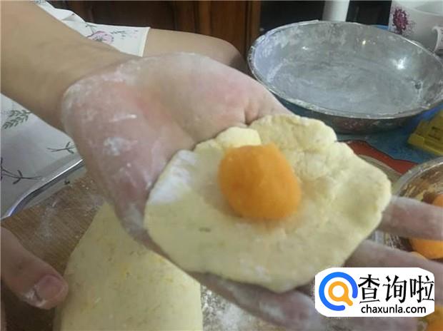 发酵好的南瓜面团,捏成一片薄薄的皮,把番薯包裹在里面,然后再捏合。