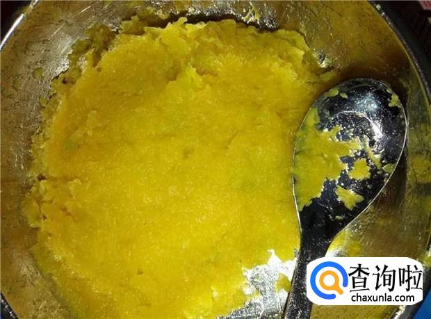 蒸软的南瓜用大勺子压碎,越碎越好,把蒸南瓜的水给倒掉。