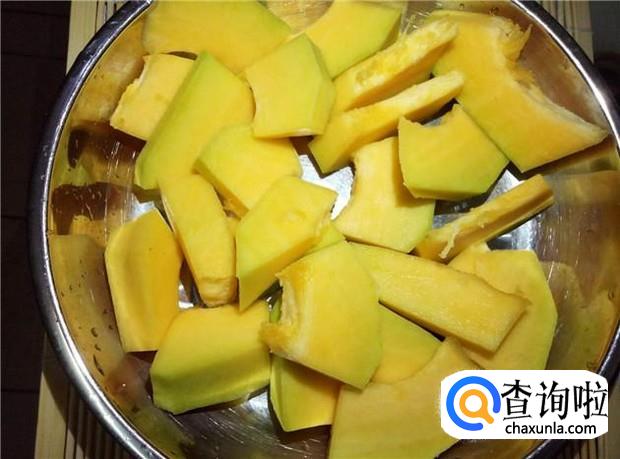 南瓜半个(要选择那些金黄色的老南瓜,这样香甜),南瓜削皮,切成小块,放在蒸锅上蒸软。