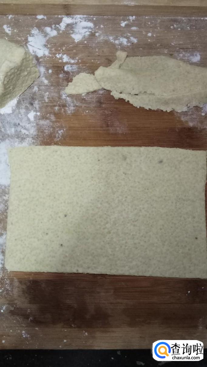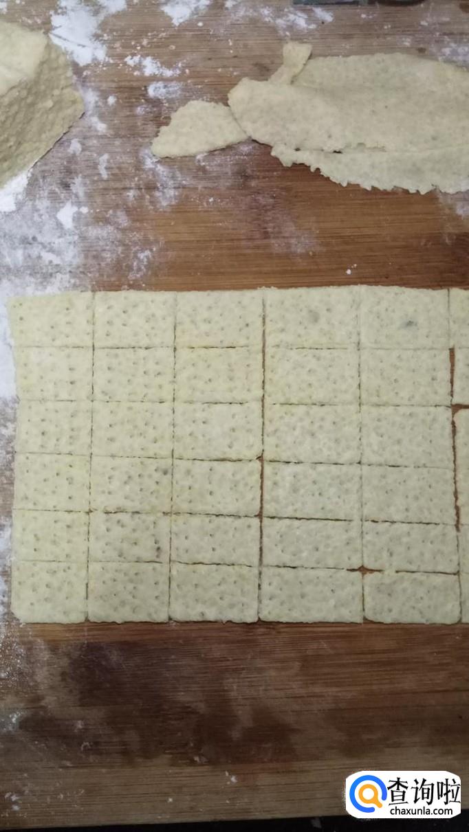 将面团擀成非常薄的片,然后将边缘裁好,用叉子叉出小圆圈,切成长方形,如图所示。