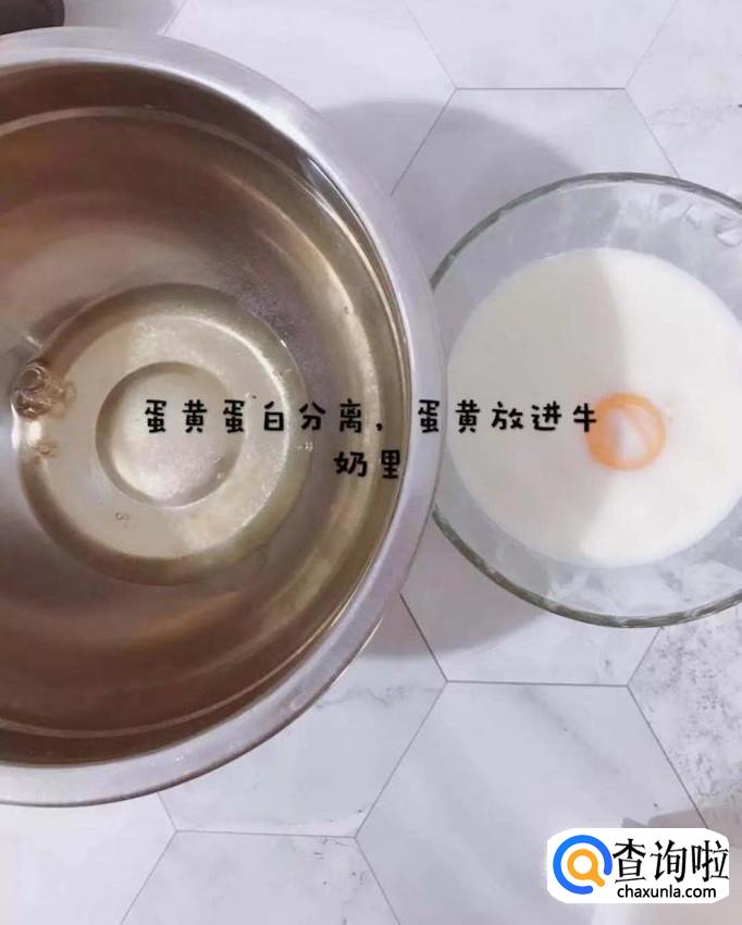 首先将蛋黄和蛋清分离,蛋黄中加入牛奶,如下图所示。
