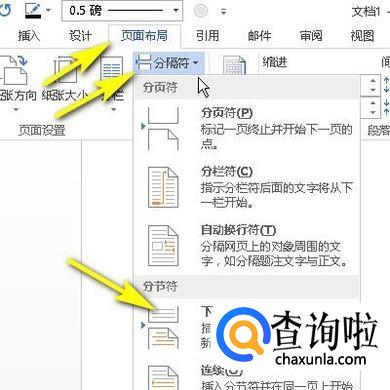 在菜单栏中,再点:页面布局;从中再点分隔符的下拉按钮,弹出菜单中再点:下一页