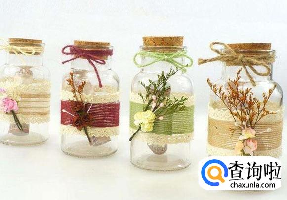 到花店买点干花,用蕾丝布将干花绑在许愿瓶上,艺术而雅致,也可以将干花放入瓶中。