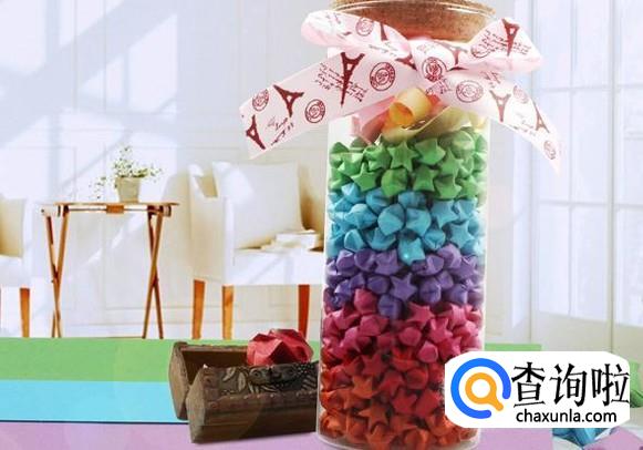 如果你会折纸,可以折些星星放在许愿瓶中,也可以将彩色折纸剪成非常细的小条放在许愿瓶中,同样非常好看。