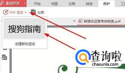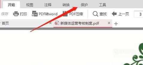 首先打开PDF文件,然后在顶部找到“保护”这个栏目,点击展开。