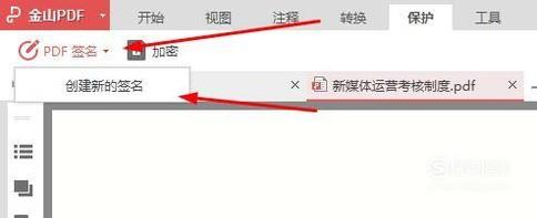 展开后我们看到“pdf签名”的选项,我们点击旁边的小三角符号后会弹出“创建新的签名”,我们点击打开。