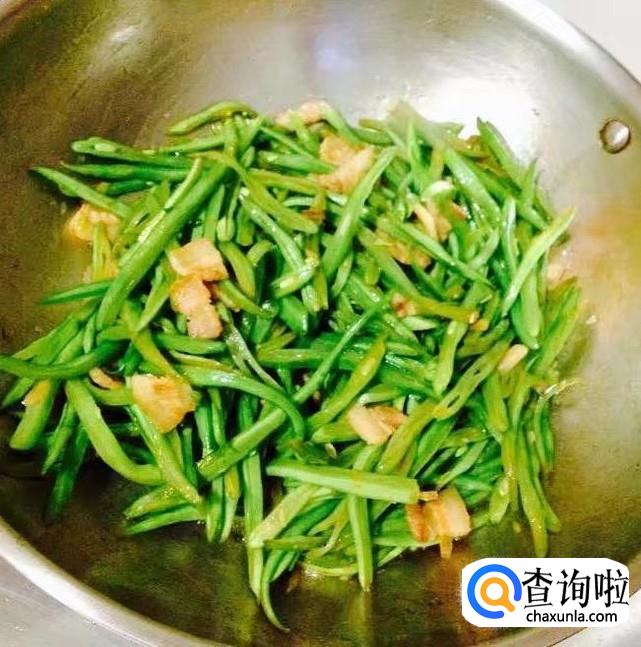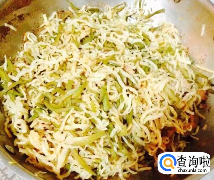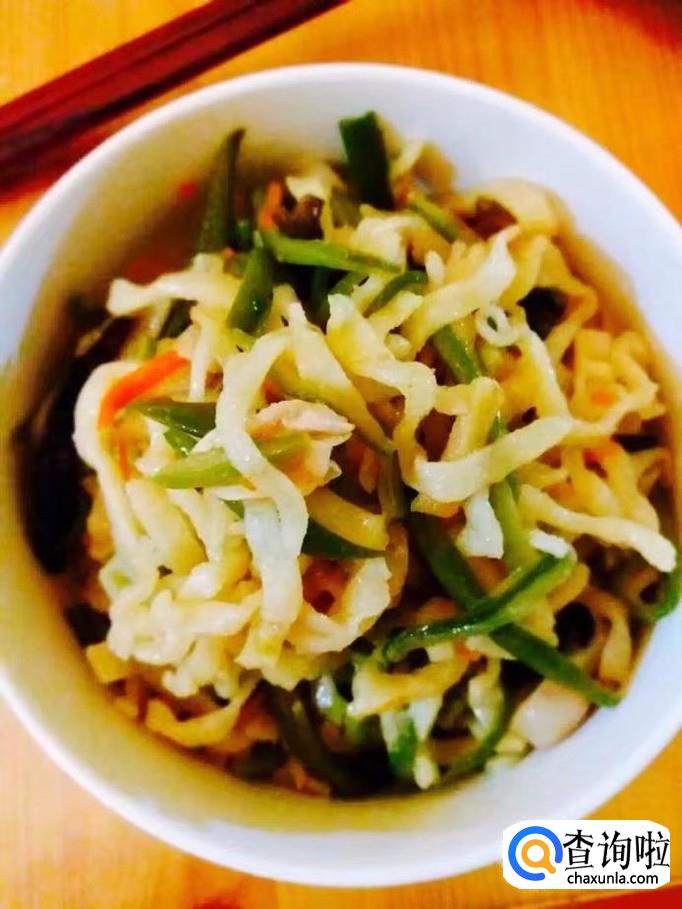 热锅加入多一点的花生油把五花肉炒出香味,放入葱花、蒜片爆香,料酒、生抽烹锅,放入芸豆丝、胡萝卜丝、木耳丝翻炒均匀至变软,加入适量的清水盖好锅盖煮沸