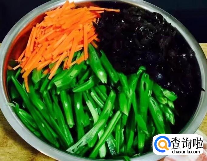 首先把芸豆、胡萝卜,水发木耳择洗干净分别切成粗丝