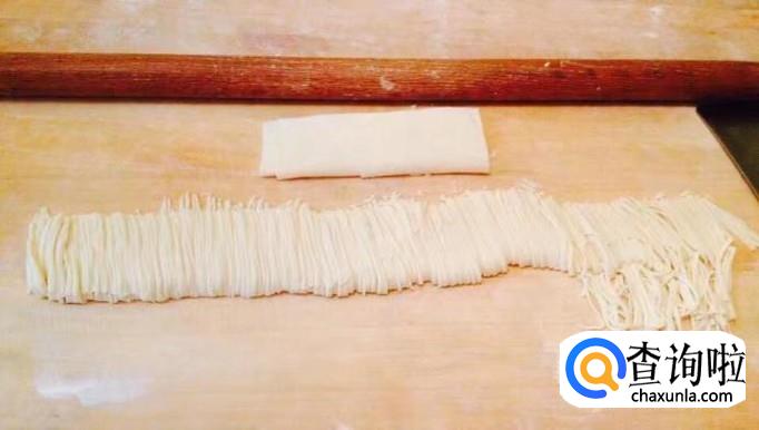 案板铺撒干面粉把醒好的面团用擀面杖擀成厚薄均匀的大面皮,然后切成出粗细均匀的面条即可