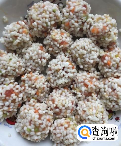 将搅拌好的肉馅团成丸子,然后滚上一层泡好的糯米。