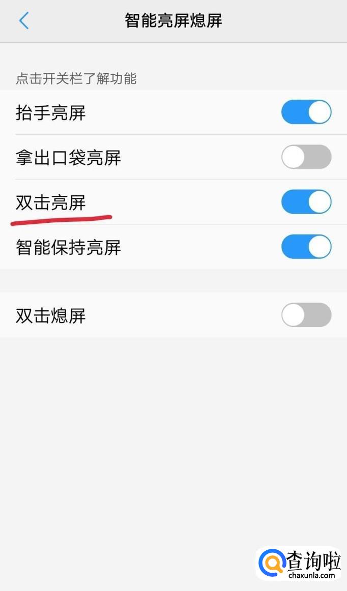 把双击亮屏勾选上就行了。在手机熄屏 状态下屏幕上双击一下就可以唤醒屏幕了。
