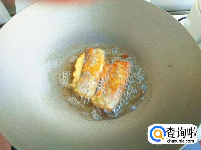一面炸金黄之后,将带鱼翻个继续炸,炸带鱼的时候油温不要太高,这一点一定要记住。并且在炸带鱼的时候,不要不停翻动。