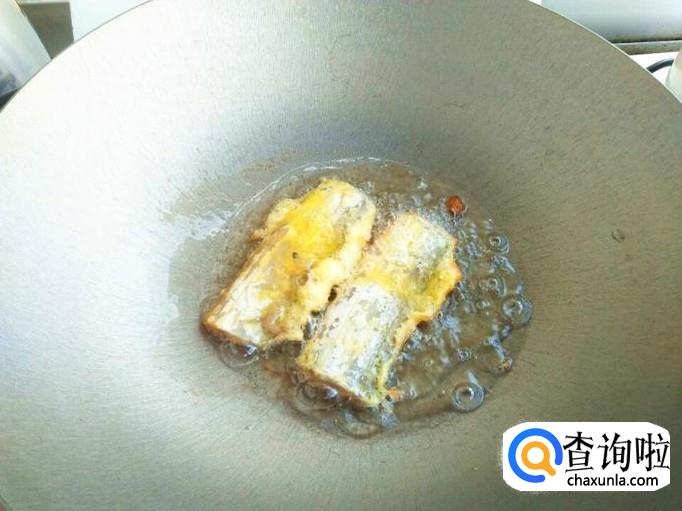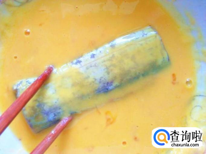 腌制好的带鱼放进鸡蛋面糊中,两面都要包裹上面糊,这样的目的是在油炸的过程中,保护鱼肉的营养不会流失。