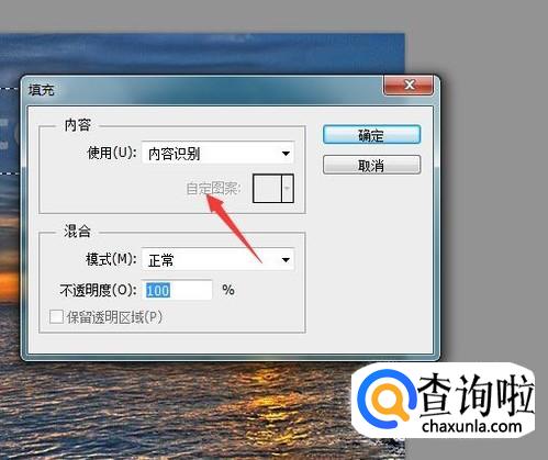 点击填充选项在弹出的对话框内找到使用选项,将其设置为内容识别选项,如图所示: