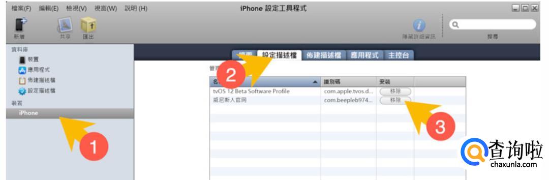 点击左侧设备名称,然后切换到「描述文件档案」,找到目标描述文件并将其删除即可。