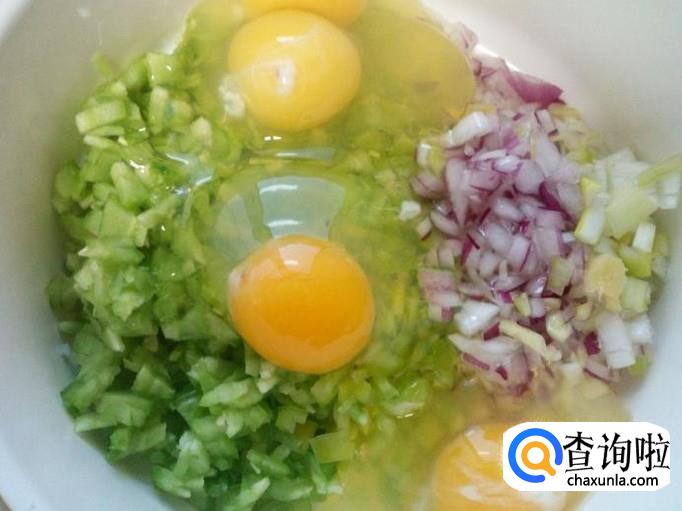 把切好的苦瓜,青尖椒,圆葱,葱,姜,一起放入碗中,然后再把鸡蛋打入碗中。