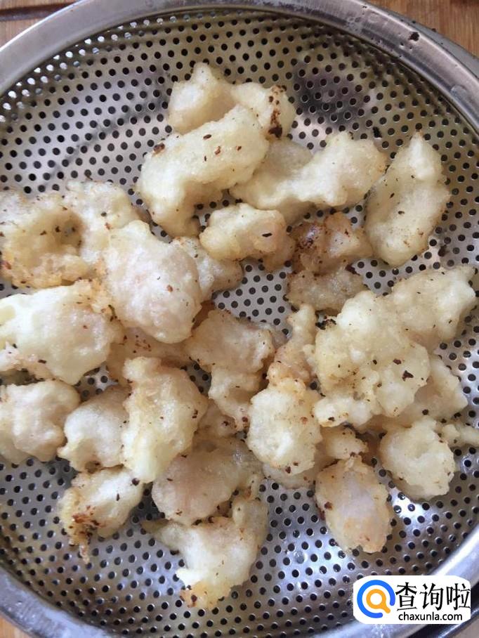 接着往锅中加入适量的食用油,待油温加热到七分热,倒入龙利鱼炸五分钟,捞出控油,如下图所示。