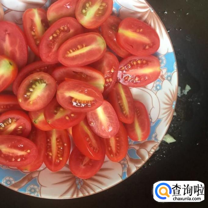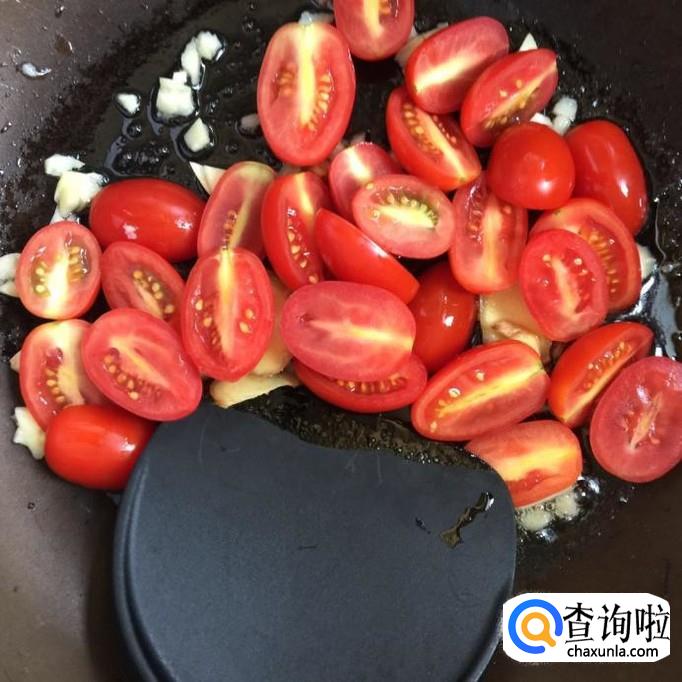 接着将圣女果对半切开,倒入锅中翻炒三分钟,如下图所示。