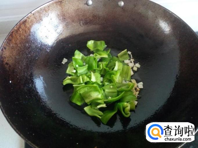 锅内重新放油加热,油热后放入葱,姜爆锅,放入青椒翻炒。
