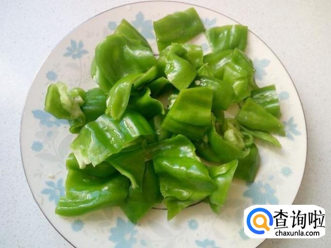 青椒用水洗净,控干水分,切成和豆腐同样大小的块。切好葱,姜,备用。