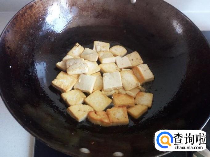 锅内放少许油加热,油热后豆腐放入锅中,中火煎塌,塌至两面微黄,盛出,装盘备用。