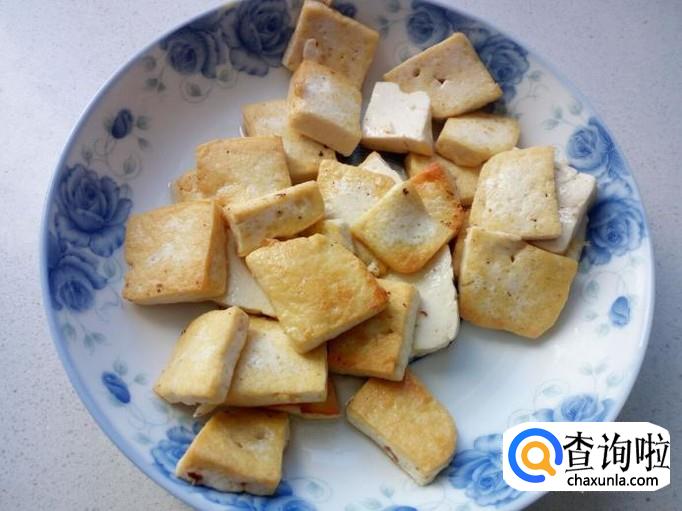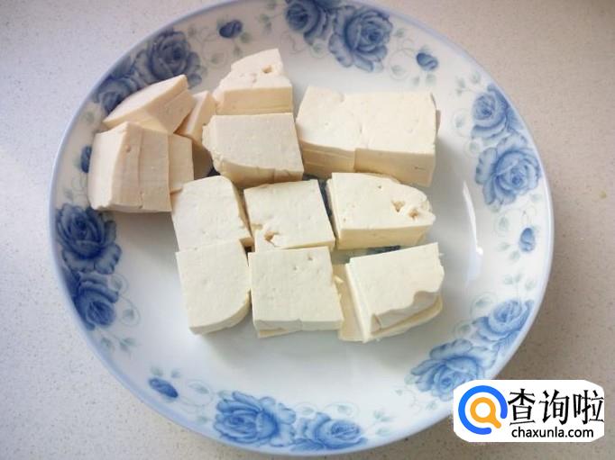 豆腐切成05公分左右厚,3公分左右见方的块,装盘备用。