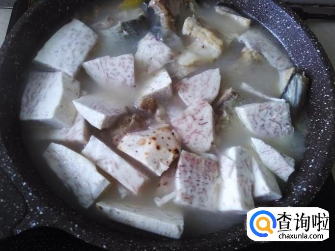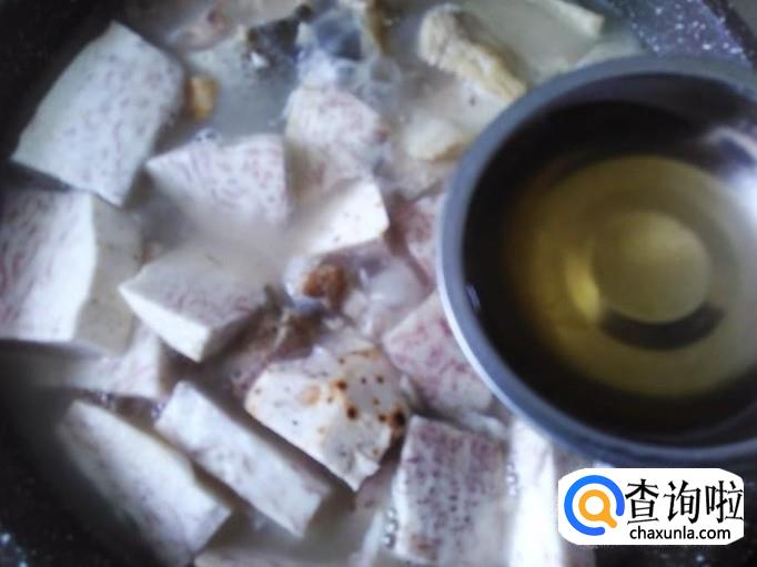 然后打开盖子,汤水变奶白色后加芋头。