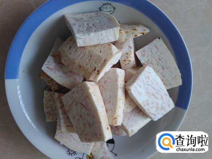 芋头切成厚片,鱼骨斩成一段段。