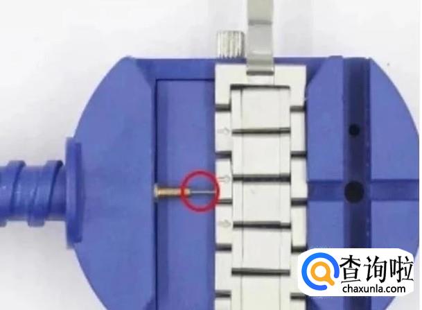 然后把自己的表带固定到工具盘上面,然后用工具上的针对准表带上面的针孔,然后把固定表带的针孔顶出来,然后去除多余的表带。
