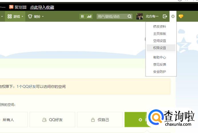 首先,我们需要在电脑上端打开QQ空间。然后在主页上点击设置,找到权限设置,点击进入。