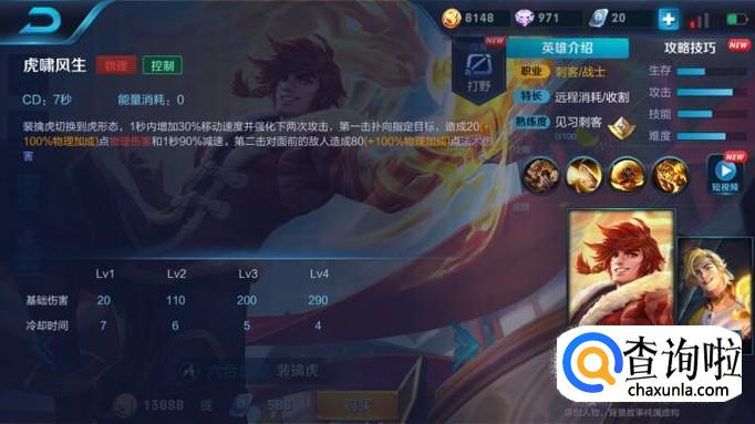 在虎形态下的一二技能分别是虎跃式和虎啸式,虎跃式可以向前突进,如果碰到墙壁可以有二段位移(可翻墙),并加强下一次普通攻击;虎啸式有类似于斩杀的效果,敌人血越少伤害越高。