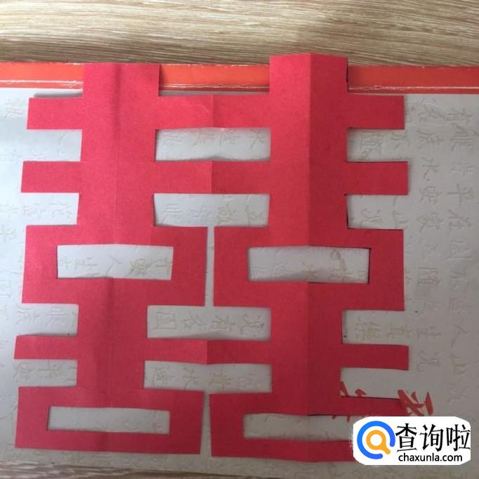 最后将折纸展开就可以了,一个普通红双喜就剪好了。