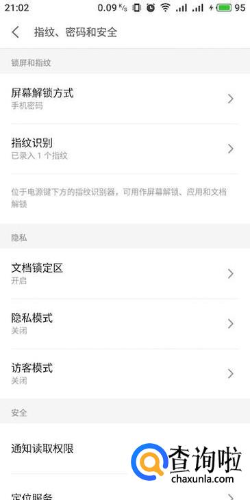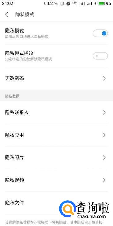 进入指纹、密码和安全设置界面,在下方选项中点击“隐私模式”