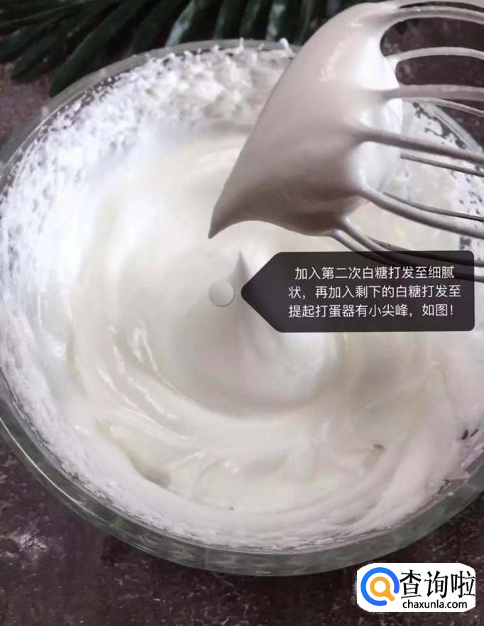 然后连续加入两次白糖打发至起尖角,如下图所示。