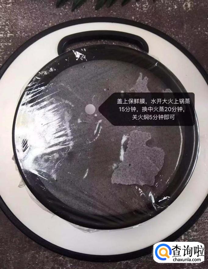 接着倒入模具中,盖上保鲜膜,水开上锅蒸15分钟,之后换中火再蒸20分钟就可以了。