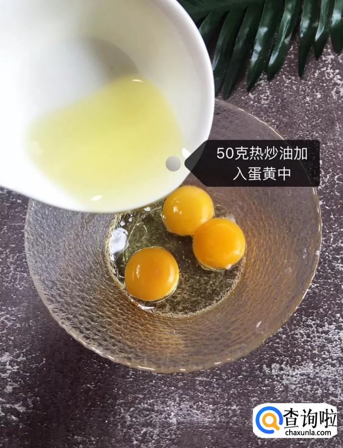 然后将50克的食用油倒入蛋黄中,如下图所示。