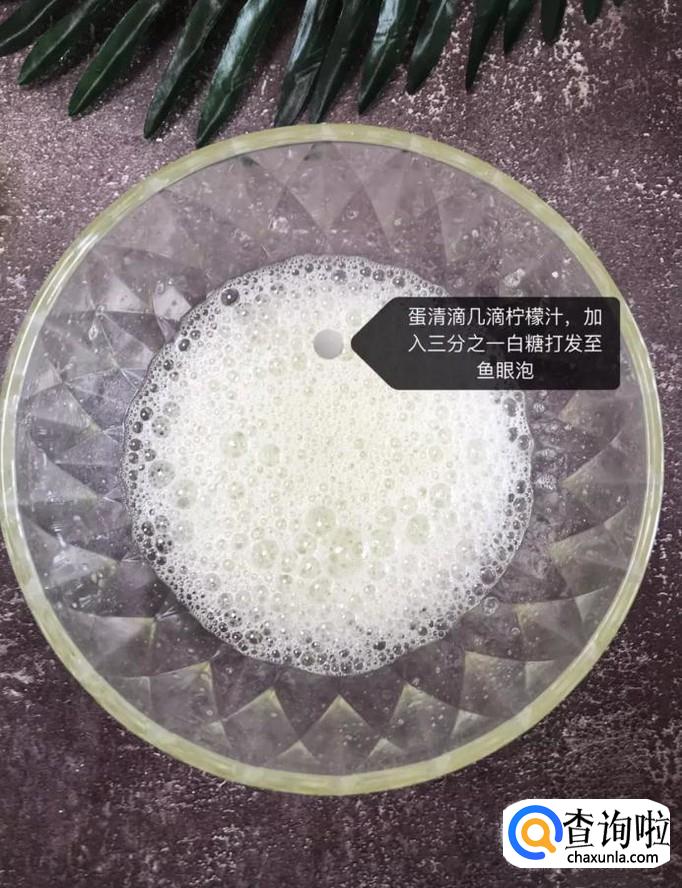 接着在蛋清中加入柠檬汁,加入1/3的白糖,搅拌均匀,如下图所示。