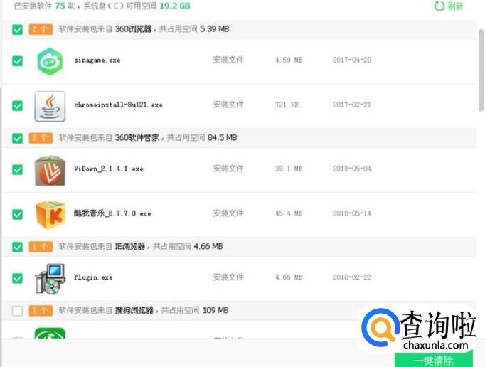 然后在右边就会显示出磁盘里的安装包,把需要删除的选上,点下面的“一键清除”,就可以了。